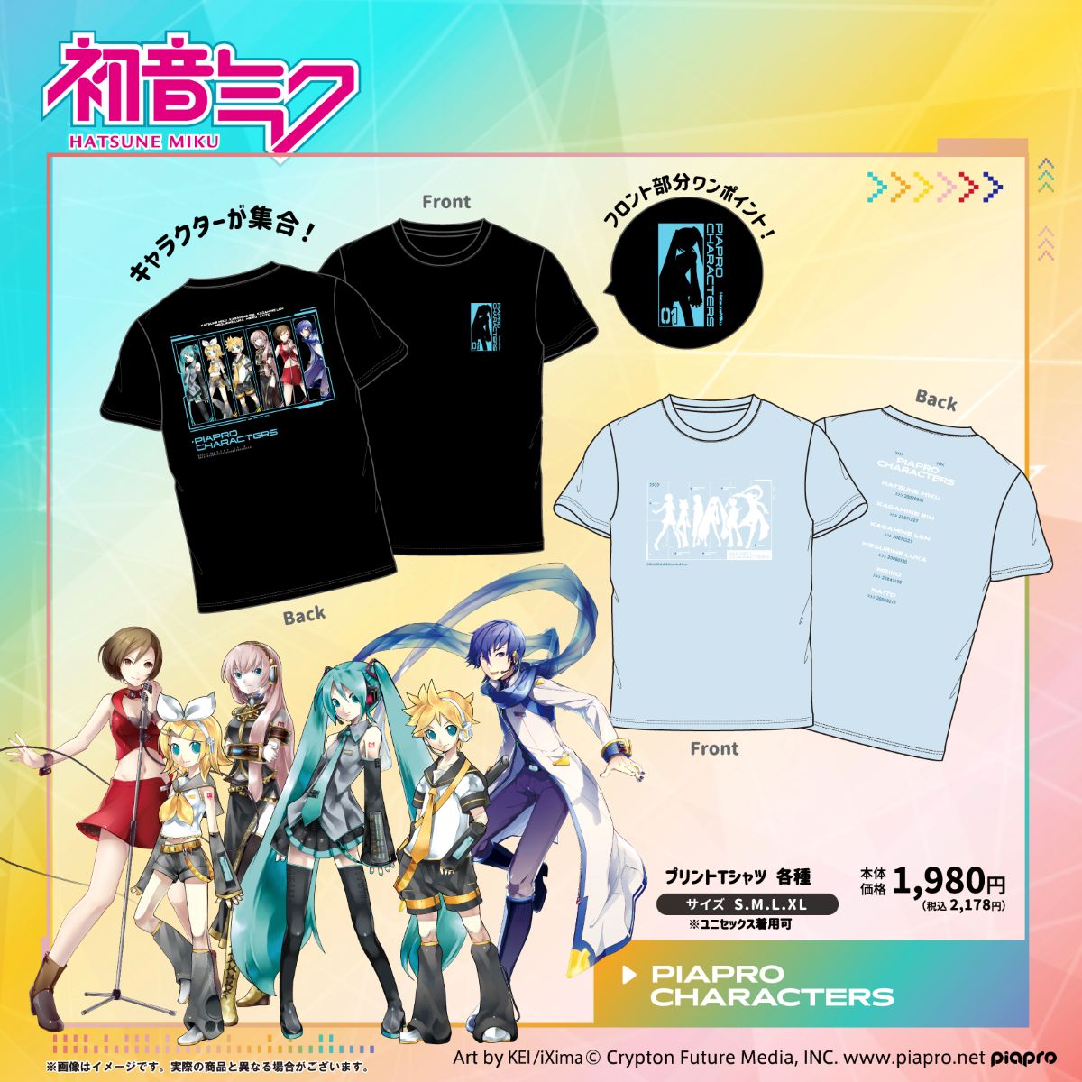 ミクのシルエットのワンポイントと6人が並んだバックプリントが格好いい、ブラックのTシャツの2種類が登場します✨